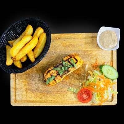 Char-grilled salmon fillet lightly seasoned and topped with a creamy mushroom sauce, spectacular in flavour.Served with salad & chips.
