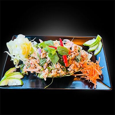 Minced chicken classic North Eastern Thai spicy minced meat salad with ground roasted rice, chilli, mint and frsh lime juice Gluten Free