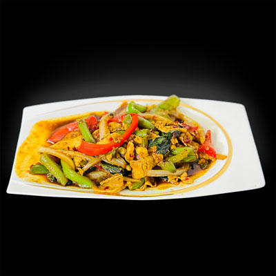 ChickenVolcano Spicy (Very, very hot) Spicy and fragrant stir fried dish served with chicken and Thai basil.