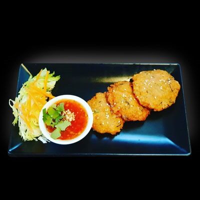 3 Pcs Thai spicy deep-fried fish cakes served with sweet chilli sauce.