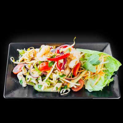 Chicken salad with chilli, lemongrass, mint leaf, carrot, strawberry and lemon dressing.